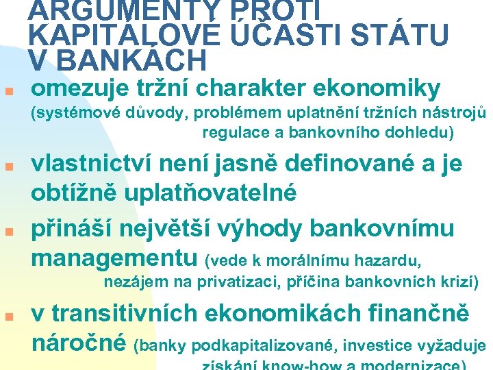 ARGUMENTY PROTI KAPITÁLOVÉ ÚČASTI STÁTU V BANKÁCH n omezuje tržní charakter ekonomiky (systémové důvody, problémem uplatnění tržních nástrojů regulace a bankovního dohledu) n n vlastnictví není jasně definované a je obtížně uplatňovatelné přináší největší výhody bankovnímu managementu (vede k morálnímu hazardu, nezájem na privatizaci, příčina bankovních krizí) n v transitivních ekonomikách finančně náročné (banky podkapitalizované, investice vyžaduje