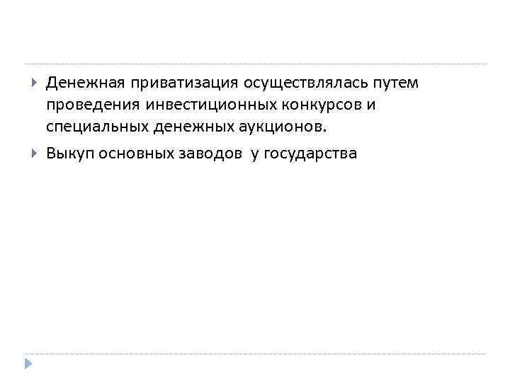 Денежная приватизация осуществлялась путем проведения инвестиционных конкурсов и специальных денежных аукционов. Выкуп основных заводов у государства