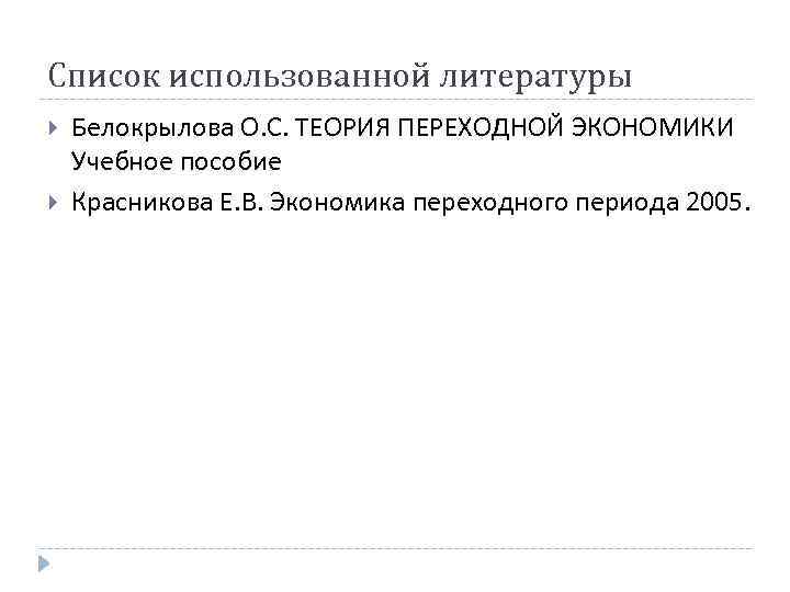 Список использованной литературы Белокрылова О. С. ТЕОРИЯ ПЕРЕХОДНОЙ ЭКОНОМИКИ Учебное пособие Красникова Е. В. Экономика переходного периода 2005.