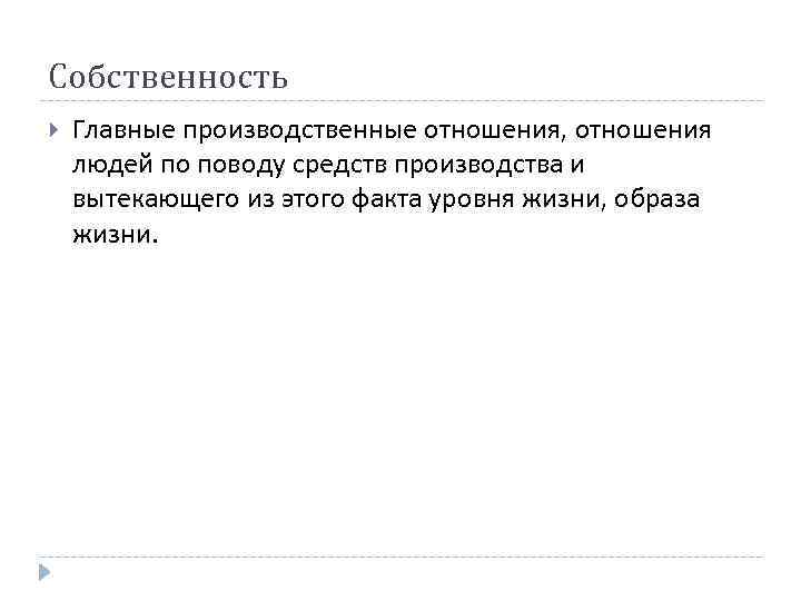 Собственность Главные производственные отношения, отношения людей по поводу средств производства и вытекающего из этого факта уровня жизни, образа жизни.