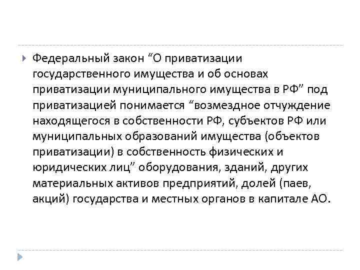 Федеральный закон “О приватизации государственного имущества и об основах приватизации муниципального имущества в РФ” под приватизацией понимается “возмездное отчуждение находящегося в собственности РФ, субъектов РФ или муниципальных образований имущества (объектов приватизации) в собственность физических и юридических лиц” оборудования, зданий, других материальных активов предприятий, долей (паев, акций) государства и местных органов в капитале АО.
