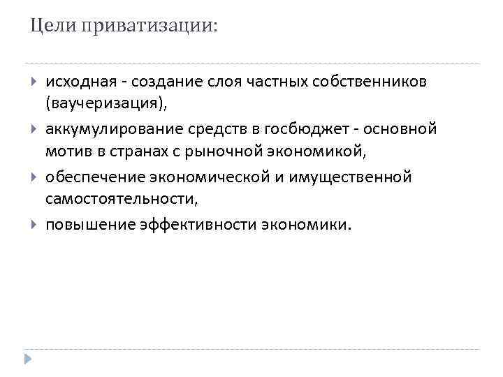 Цели приватизации: исходная - создание слоя частных собственников (ваучеризация), аккумулирование средств в госбюджет - основной мотив в странах с рыночной экономикой, обеспечение экономической и имущественной самостоятельности, повышение эффективности экономики.