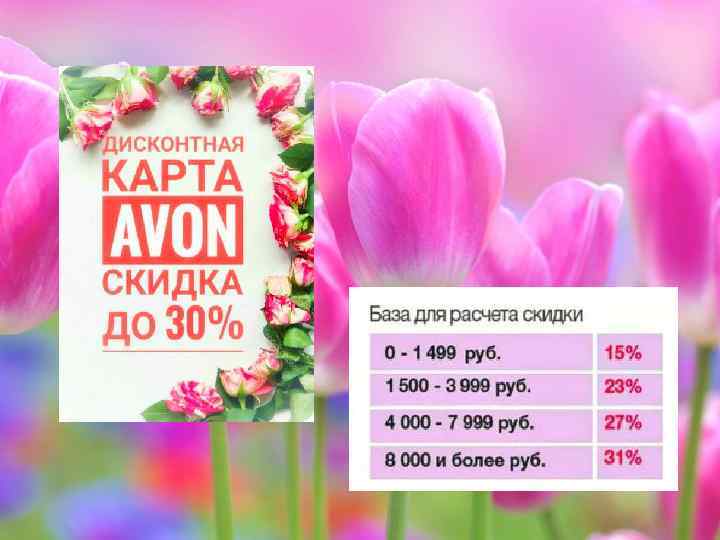 Дисконтная карта AVON дает право: • делать заказы со скидкой от 15 до 30% • получать заказы и подарки за них получить доступ к закрытым распродажам • участвовать в специальных акциях и предложениях от компании • оплачивать заказ в течении 5!!! дней после получения