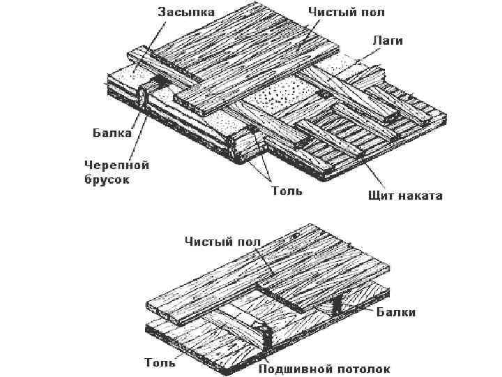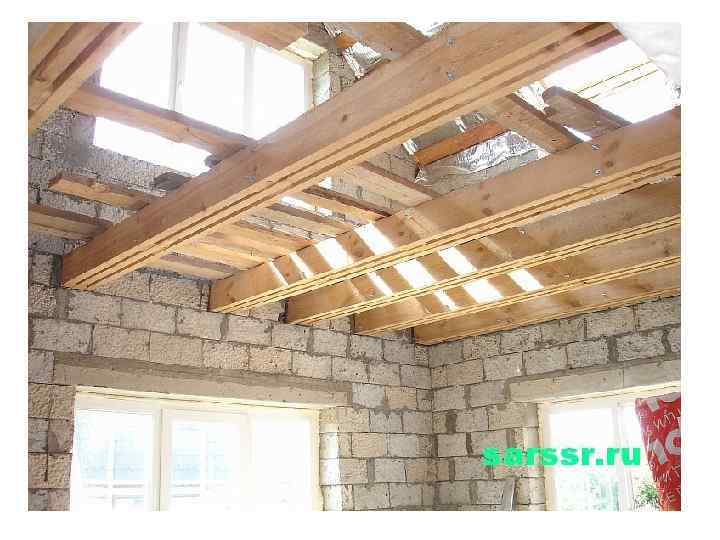 • В малоэтажном строительстве применяются перекрытия по деревянным балкам. Деревянные перекрытия состоят из балок и наката или деревянных щитов.
