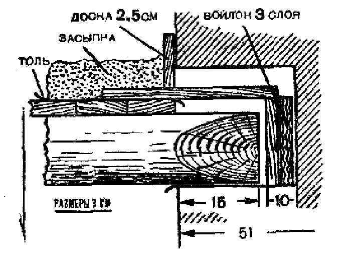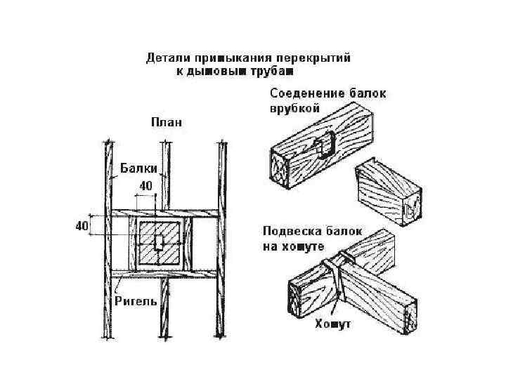 Устройство пропуска труб в перекрытиях по деревянным балкам 1 – пропитанные антипереном балки 2 – балки перекрытия 3 – поперечены 4 - кирпичная кладка