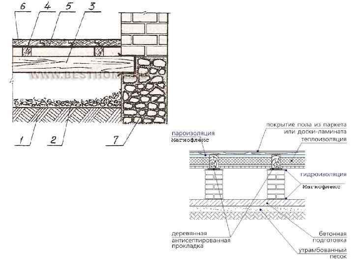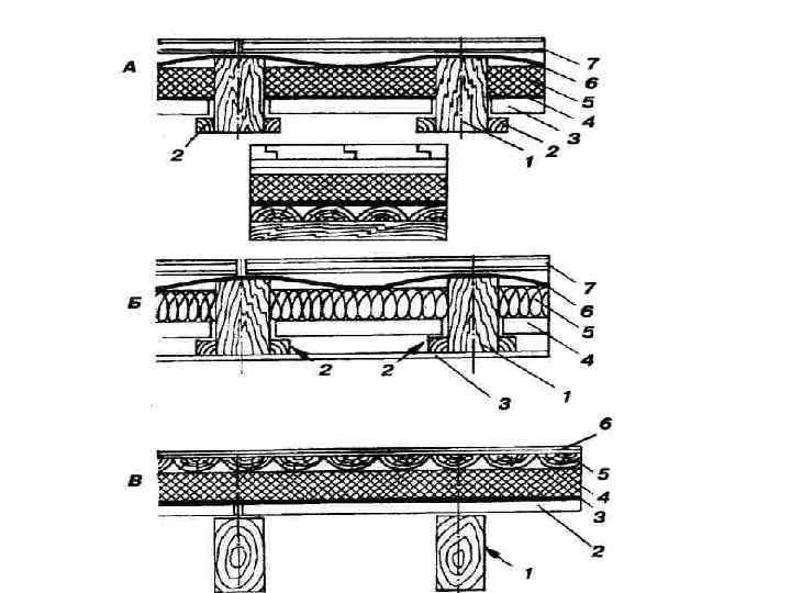 Устройство пола по деревянным балкам в санузлах 1 – керамическая плитка 2 – стяжка 3 – г. и. 4 – доски пола 5 – плинтус керамический 6 – силиконизированый акрил