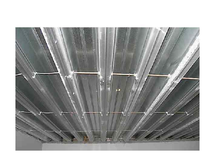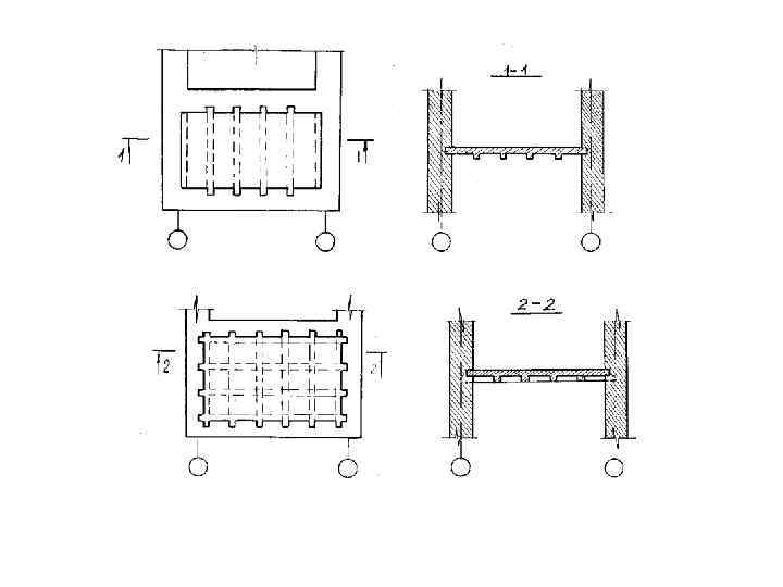 Монолитные ребристые перекрытия • Если применении железобетонных перекрытий необходимо сделать ровный потолок, следует уменьшить расстояние по оси между балками на 0, 5 -1 м. Сечение балок меньше, поэтому их называют ребрами. Чтобы ребра не выпучивались, их армируют при пролете 6 м одним поперечным ребром. Ровный потолок отделывают подшивкой и известково-гипсовой штукатуркой или штукатуркой по камышу. До бетонирования ребристого железобетонного перекрытия в арматуру закладывают штыри или проволоку диаметром 10 мм таким образом, чтобы после бетонирования и распалубки они выступали с боков ребер. На эти закладные детали устанавливают планки толщиной 2 см, нижний край которых выступает за грань нижнего ребра на 1 см. Другой способ заключается в том, что при изготовлении опалубки ребра в нее помещают до закладки арматуры и закрепляют дощатое дно, после чего оба конца проволоки замоноличивают. К изготовленному таким образом основанию крепят обшивку из плит толщиной 12 - 20 мм, прибиваемых гвоздями. Швы между плитами не должны быть шире 15 мм. На обшивку наносят простую штукатурку или подбивают камышовым матом. Иногда в плиту и ребра замоноличивают проволоку и к ней после распалубки крепят сетку Рабица и наносят известково-гипсовую штукатурку.