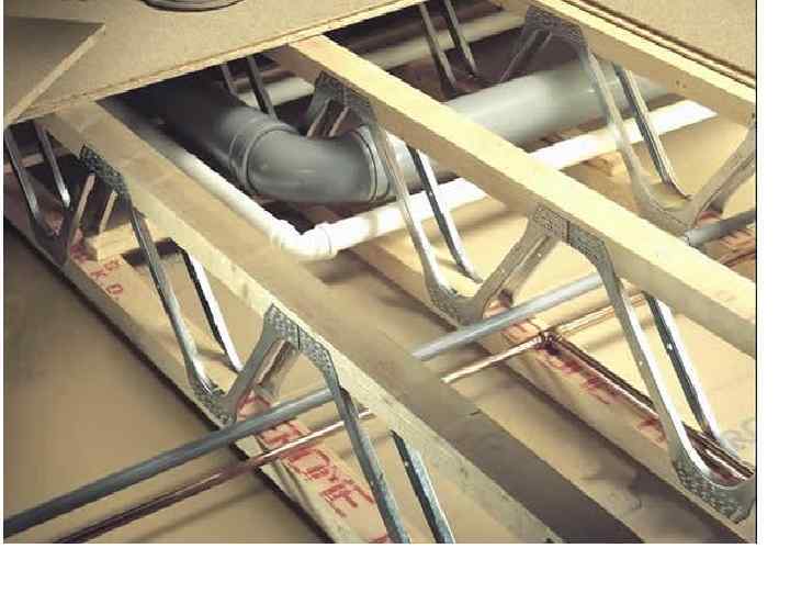 Часторебристые сборно-монолитные перекрытия состоят из легких железобетонных балок, выполненных в виде пространственного стального арматурного каркаса и железобетонного основания (балки) прямоугольного поперечного сечения, пустотных блоков и заливаемого на объекте монолитного бетона. Пустотные блоки (вкладыши), укладываемые на железобетонные балки, могут быть керамическими, газосиликатными, полистиролбетонными либо бетонными. Такие перекрытия имеют прекрасные звукоизоляционные и теплотехнические качества, а в имеющихся в блоках каналах без проблем размещаются коммуникации, в том числе электропроводка. Важно и то, что рассматриваемые перекрытия могут успешно применяться при строительстве малоэтажных домов способом "Строю сам". Практика свидетельствует - на стены, возведенные по любой технологии, всего два-три человека способны уложить железобетонные балки, на них - вкладыши, а затем полученное основание (несъемную опалубку) залить бетоном.