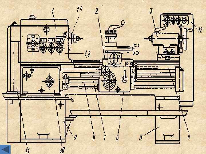 Устройство токарно-винторезного станка ТВ-7 • Сборочные единицы (узлы) и механизмы токарновинторезного станка: 1 - передняя бабка, 2 суппорт, 3 - задняя бабка, 4 - станина, 5 и 9 тумбы, 6 - фартук, 7 - ходовой винт, 8 - ходовой валик, 10 - коробка подач, 11 - гитары сменных шестерен, 12 - электро-пусковая аппаратура, 13 коробка скоростей, 14 - шпиндель
