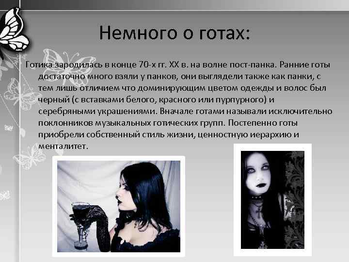 Немного о готах: Готика зародилась в конце 70 -х гг. XX в. на волне пост-панка. Ранние готы достаточно много взяли у панков, они выглядели также как панки, с тем лишь отличием что доминирующим цветом одежды и волос был черный (с вставками белого, красного или пурпурного) и серебряными украшениями. Вначале готами называли исключительно поклонников музыкальных готических групп. Постепенно готы приобрели собственный стиль жизни, ценностную иерархию и менталитет.