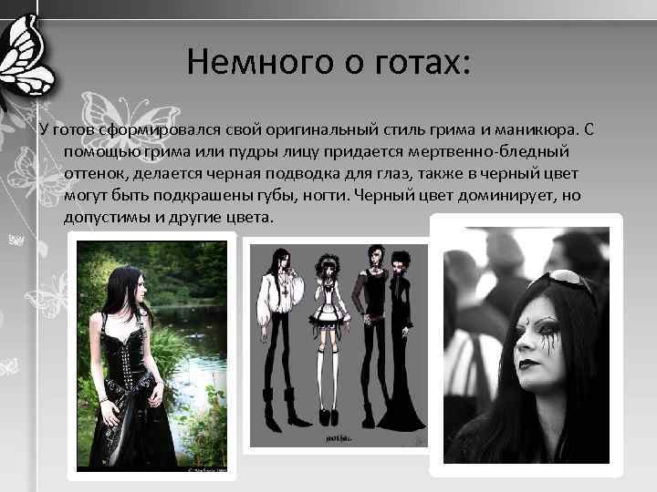 Немного о готах: У готов сформировался свой оригинальный стиль грима и маникюра. С помощью грима или пудры лицу придается мертвенно-бледный оттенок, делается черная подводка для глаз, также в черный цвет могут быть подкрашены губы, ногти. Черный цвет доминирует, но допустимы и другие цвета.