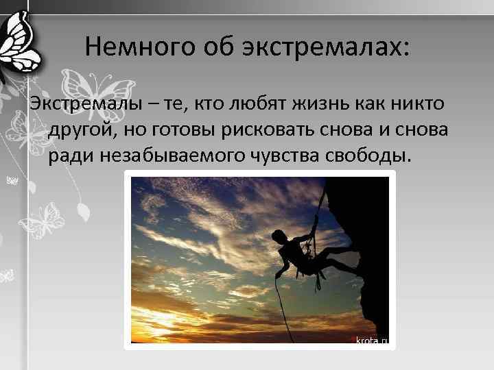 Немного об экстремалах: Экстремалы – те, кто любят жизнь как никто другой, но готовы рисковать снова и снова ради незабываемого чувства свободы.