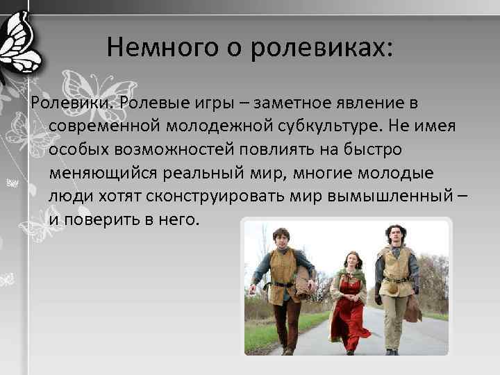 Немного о ролевиках: Ролевики. Ролевые игры – заметное явление в современной молодежной субкультуре. Не имея особых возможностей повлиять на быстро меняющийся реальный мир, многие молодые люди хотят сконструировать мир вымышленный – и поверить в него.