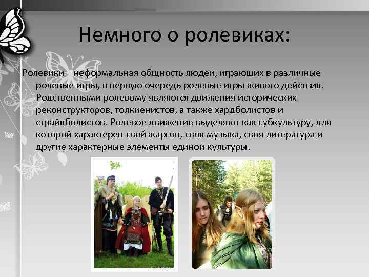 Немного о ролевиках: Ролевики – неформальная общность людей, играющих в различные ролевые игры, в первую очередь ролевые игры живого действия. Родственными ролевому являются движения исторических реконструкторов, толкиенистов, а также хардболистов и страйкболистов. Ролевое движение выделяют как субкультуру, для которой характерен свой жаргон, своя музыка, своя литература и другие характерные элементы единой культуры.