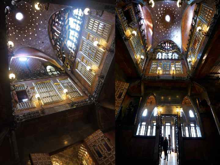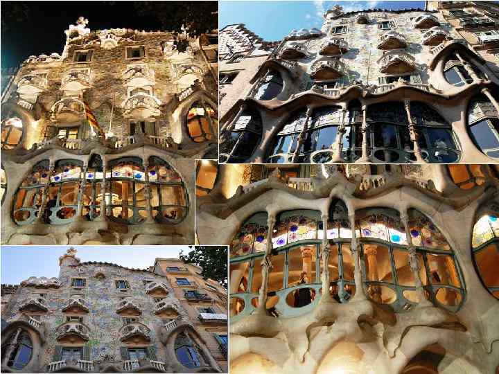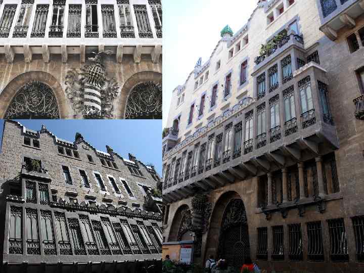 Палац Ґуель (1885— 1889 р. р. ) • Палац Ґуель — міський будинок, замовлений промисловцем (та багаторічним спонсором Ґауді) Аузебі Ґуелєм. • Фасад будинку облицьований плитами сірого мармуру, лише між двома арками встановлена декоративна колона з каталонською емблематикою та вензелями господаря. • Через незвичні арки параболічної форми гості могли вільно проїжджати в просторий вестибюль будинку прямо в екіпажах, а в самому вестибюлі передбачений спіральний спуск в підвал, де знаходяться стайні. • Фасад будинку Бальо • В будинку 127 колон, і кожна з них унікальна — від приземлених, грибовидних в підвалі до елегантних полірованих з піренейського змійовика в приймальній залі. • В центрі будинку знаходиться зал з куполом висотою 17, 5 метрів. В залі також встановлений орган унікальної конструкції з системою труб, які виходять в верхню галерею. • Інші кімнати розташовані навкруг центральної зали. Особливо цікавим є оформлення стелі кожної з кімнат. Розкішна кипарисова та евкаліптова обшивка, ажурна металева арматура. Не менш унікальними є й меблі, також спроектовані Ґауді. • На стелі будинку знаходиться невеликий купол з загостреною вежею. Він оточений 18 вишуканими кам'яними скульптурами.