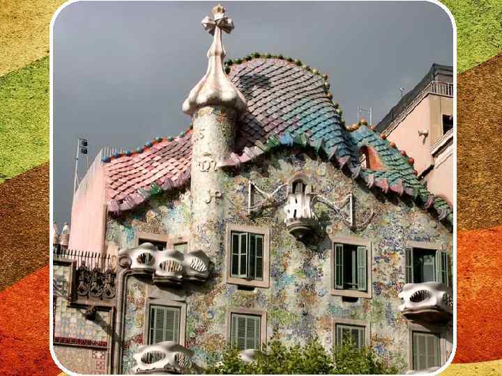Будинок Батльо (1905— 1907 р. р. ) • В будинку Бальо (кат. Casa Batlló) Ґауді досягнув апогею своєї захопленості криволінійними формами та «органічними» мотивами, застосувавши його абсолютно до всього — від фасаду до інтер'єрів та меблювання. Покрівля викладена черепицею так, що нагадує риб'ячу луску. Сальвадор Далі з захопленням писав про цей будинок: «Це величезна, дивовижна, яскрава, переливчаста мозаїка з неперевершеною грою фарб, що іскряться, а з них проступають водні стихії»