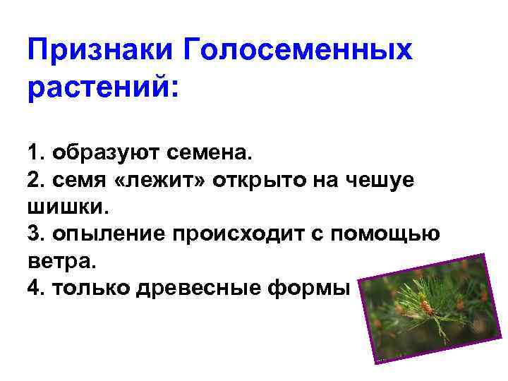 Признаки Голосеменных растений: 1. образуют семена. 2. семя «лежит» открыто на чешуе шишки. 3. опыление происходит с помощью ветра. 4. только древесные формы
