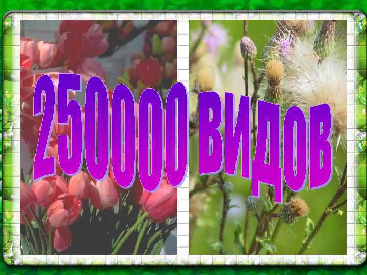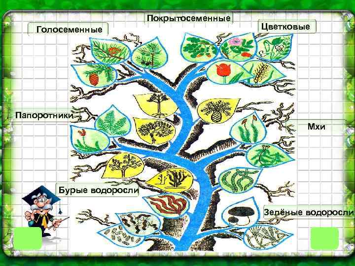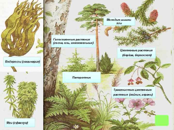 Покрытосеменные Голосеменные Цветковые Папоротники Мхи Бурые водоросли Зелёные водоросли
