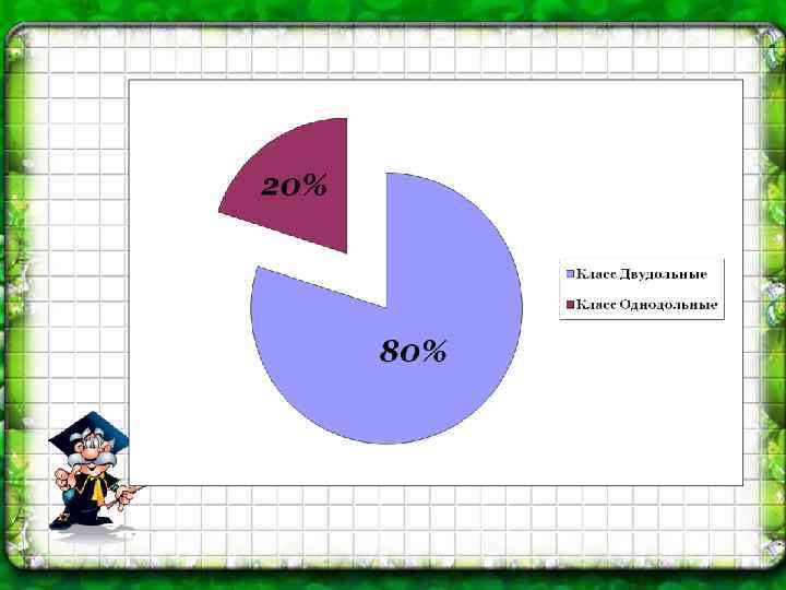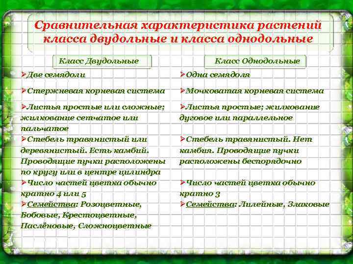 Сравнительная характеристика растений класса двудольные и класса однодольные Класс Двудольные Класс Однодольные ØДве семядоли ØОдна семядоля ØСтержневая корневая система ØМочковатая корневая система ØЛистья простые или сложные; жилкование сетчатое или пальчатое ØСтебель травянистый или деревянистый. Есть камбий. Проводящие пучки расположены по кругу или в центре цилиндра ØЧисло частей цветка обычно кратно 4 или 5 ØСемейства: Розоцветные, Бобовые, Крестоцветные, Паслёновые, Сложноцветные ØЛистья простые; жилкование дуговое или параллельное ØСтебель травянистый. Нет камбия. Проводящие пучки расположены беспорядочно ØЧисло частей цветка обычно кратно 3 ØСемейства: Лилейные, Злаковые