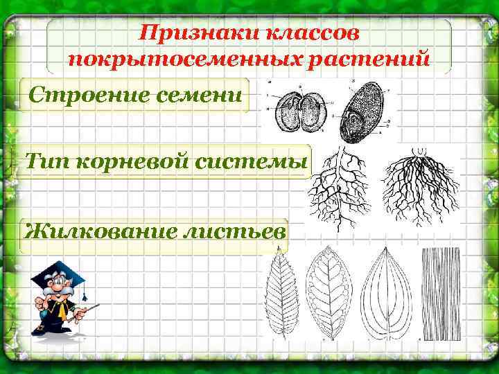 Признаки классов покрытосеменных растений Строение семени Тип корневой системы Жилкование листьев