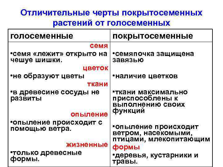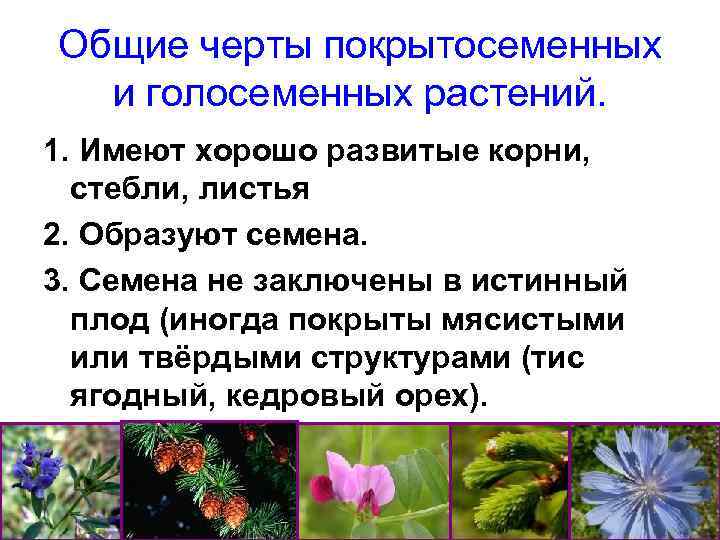 Общие черты покрытосеменных и голосеменных растений. 1. Имеют хорошо развитые корни, стебли, листья 2. Образуют семена. 3. Семена не заключены в истинный плод (иногда покрыты мясистыми или твёрдыми структурами (тис ягодный, кедровый орех).