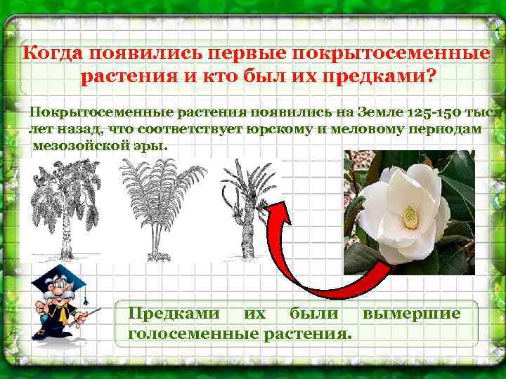 Когда появились первые покрытосеменные растения и кто был их предками? Покрытосеменные растения появились на Земле 125 -150 тысяч лет назад, что соответствует юрскому и меловому периодам мезозойской эры. Предками их были вымершие голосеменные растения.