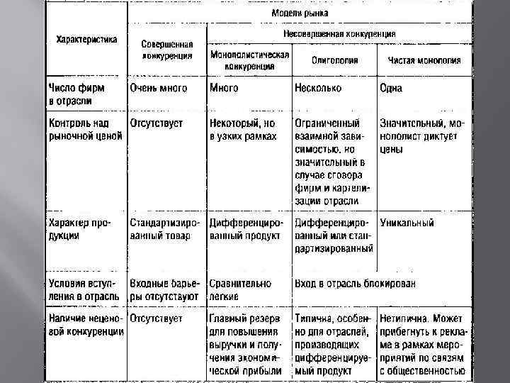 В зависимости от содержания каждого признака и их сочетания формируются разные типы отраслевых рынков— совершенной конкуренции, монополистической конкуренции, олигополии и чистой монополии.