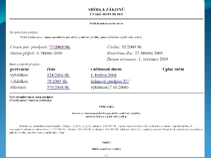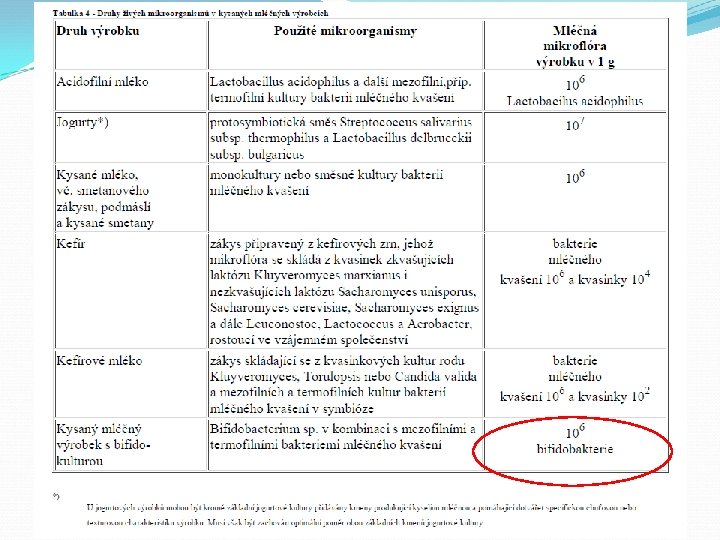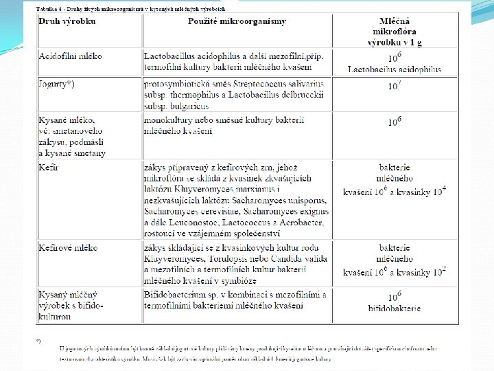 Terapeutické minimum q Za „terapeutické minimum“ se považuje denní konzumace alespoň 100 g mléčného výrobku, který obsahuje minimálně 106 probiotických bakterií v 1 g nebo 1 ml. q Pro jednotlivé skupiny kysaných mléčných výrobků je množství bakterií použité mikrobiální kultury stanoveno vyhláškou Ministerstva zemědělství ČR č. 328/1997 Sb. , k zákonu č. 110/1997 Sb. ve znění pozdějších předpisů