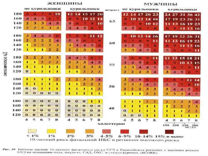 Шкала SCORE оценивает суммарный риск смерти от ССЗ в ближайшие 10 лет. Учитываются пол, возраст, статус курения, САД и уровень общего ХС в сыворотке крови.