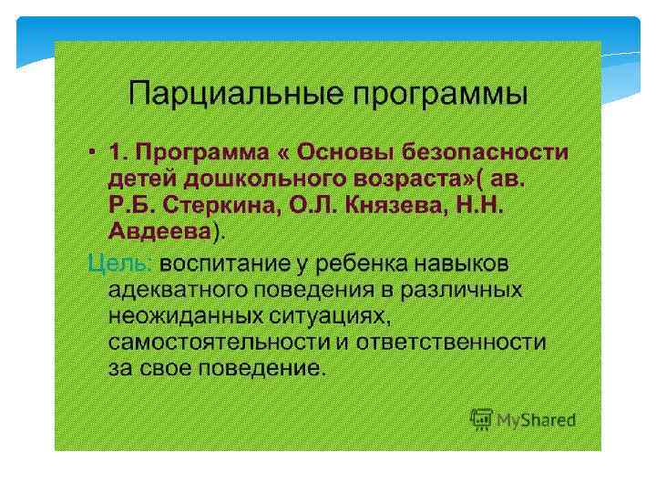 Парциальные программы дошкольного образования · Программа здоровьесберегающего направления «Основы безопасности детей дошкольного возраста» · Программы экологического воспитания · Программы художественно-эстетического цикла · Программы социально-нравственного развития дошкольников · Программы физического развития и здоровья дошкольников