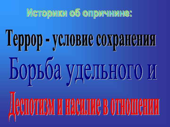 Опричнина – 1556 – 1572 гг. – ( «оприч» - кроме) – политика Ивана IV, которая привела к разделу земель Русского государства на земские под управлением Боярской думы (так называемая земщина) и опричные (Государев удел) с «государевым двором» и особым войском, сопровождающаяся террором и репрессиями как средством достижения политических целей.