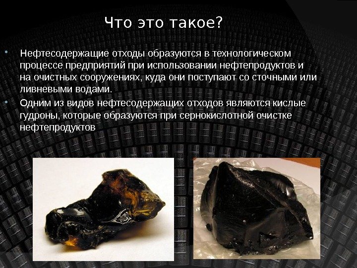 Что это такое? Нефтесодержащие отходы образуются в технологическом процессе предприятий при использовании нефтепродуктов и на очистных сооружениях, куда они поступают со сточными или ливневыми водами. Одним из видов нефтесодержащих отходов являются кислые гудроны, которые образуются при сернокислотной очистке нефтепродуктов