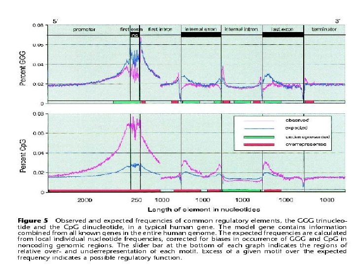 Маевский и Отт – возможная роль Cp. G в сплайсинге, отсюда и падение в 3’-конце последнего экзона, который не сплайсируется. Вообще в интронах Cp. G-острова мало представлены (см. презентацию Ю. Медведевой), но GGG-тринуклеотиды, характерные для Cp. G-островов – на самой границе интронов и экзонов. %Cp. G для гена в целом в работе Виноградова, который коррелировал с шириной экспрессии, это, по существу, Cp. G внутригенных островов.
