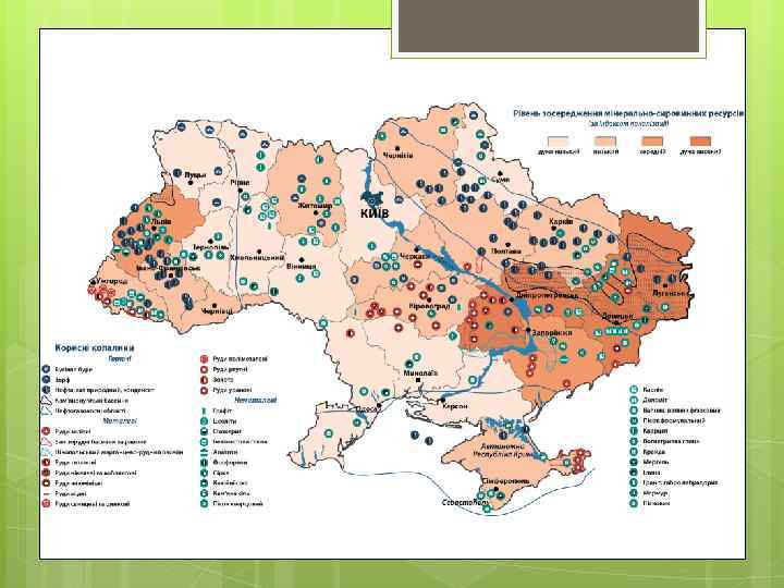 2. 1. Головні проблеми України у сфері екології Надексплуатація природних ресурсів та їх нераціональне використання є однією з першопричин низької конкурентоспроможності національної економіки, економічної та екологічної кризи і зниження рівня соціальних гарантій. Економічна модель, що склалася в Україні за останні 20 років, призводить до виснаження природного довкілля, утворення величезних обсягів викидів, скидів та відходів, зростання загроз здоров’ю та добробуту людей, накопиченню значних екологічних наслідків довготривалого характеру.