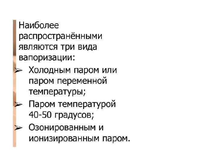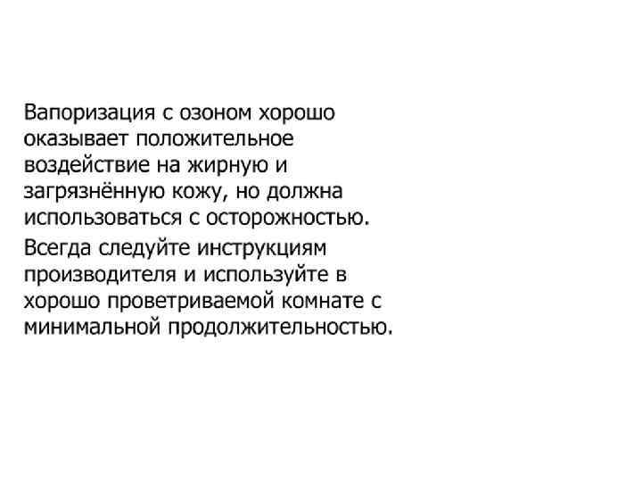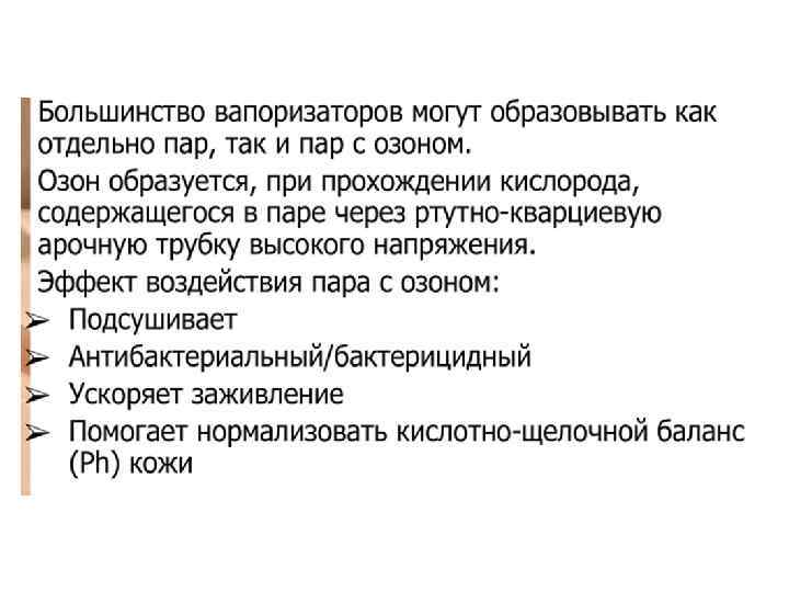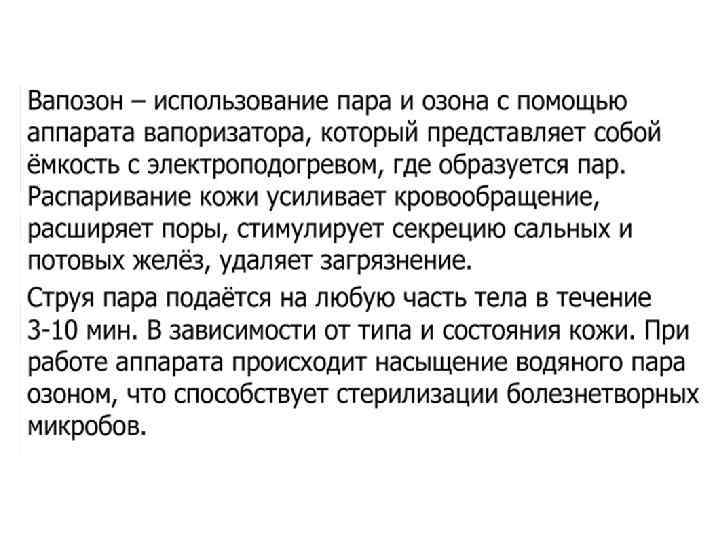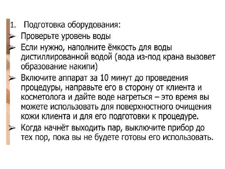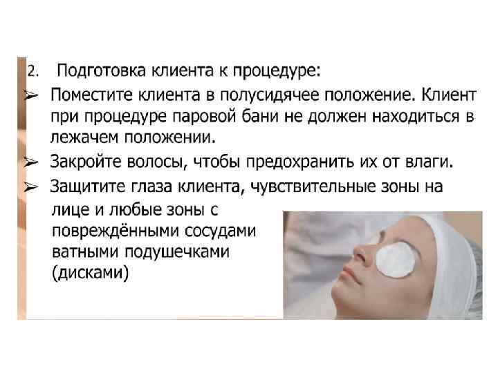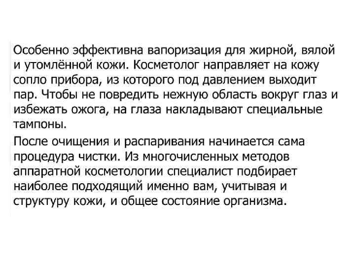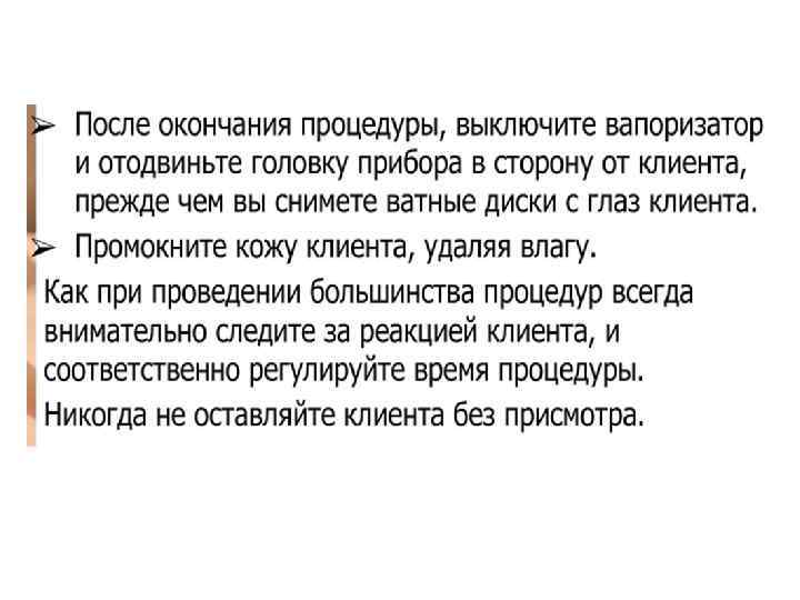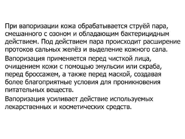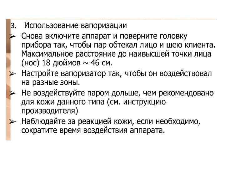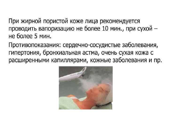 Ø Струя пара должна быть полной и широкой. Косметолог направляет струю пара по касательной, снизу вверх, так, чтобы пар равномерно распределялся по всей поверхности лица. Расстояние от сопла до лица определяется по ощущениям на руке косметолога (рука расположена в проекции лица клиента, расстояние до сопла от 100 до 40 см), воздействие пара должно ощущаться в виде легкого тепла. Ø Для сохранения тепла и увлажненности после вапоризации во время проведения чистки желательно закрыть поверхность лица пленкой или теплым влажным полотенцем.