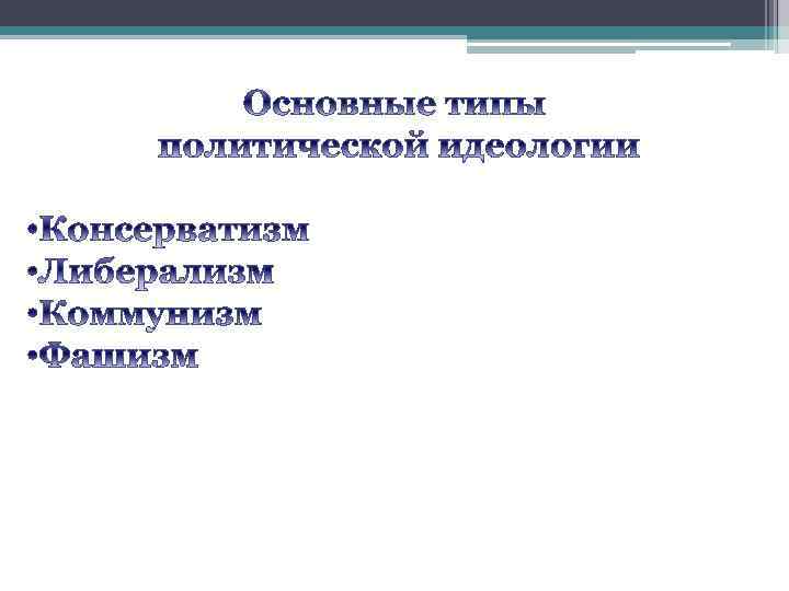 Разновидности идеологий Коммунистическая Общественная собственность на средства производства Диктатура пролетариата Социальная справедливость
