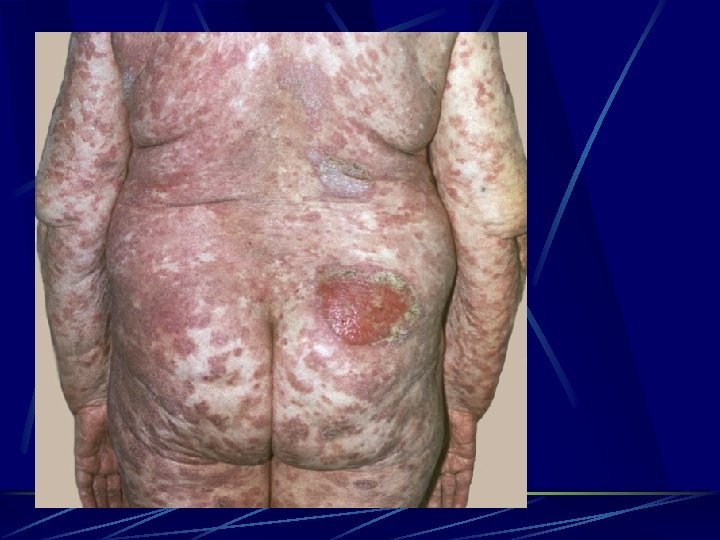 Клинический случай № 4, пациент 58 лет. Считает себя больным с февраля 2014 г. , когда появились высыпания на коже. Обследован, проходил лечение в условиях Краевого дермато-венерологического диспансера, без улучшения. Направлен на обследование в пол-ку АКОД. УЗИ от 29. 09. 14 г. – структурно-измененные подчелюстные лимфоузлы слева, шейно-надключичные слева, аксиллярные и паховые лимфоузлы. 30. 09. 14 г. – пункционная биопсия под конторолем УЗИ, ЦД № 16169 от 30. 09. 14 г. – лимфоидные элементы. 01. 10. 14 г. – биопсия образования на коже правого плеча, левого бедра. ИГХ № 079570 от 27. 10. 14 г. – дермальная CD 4 -положительная мелко/среднеклеточная Т-клеточная лимфома. 30. 12. 14 осмотрен гематологом Миелограмма № 1753 от 26. 12. 14 Заключение: данных за ЛПЗ нет. Диагноз. Данных за лейкемизацию процесса на момент осмотра нет. STATUS LOCALIS: На коже верхних, нижних конечностей и туловища множественные высыпания красного цвета, сливающиеся между собой, с шелушением. Периферические лифоузлы не увеличены. DS: Неходжкинская Т-клеточная лимфома IIIа ст, с поражением кожи верхних, нижних конечностей и туловища.