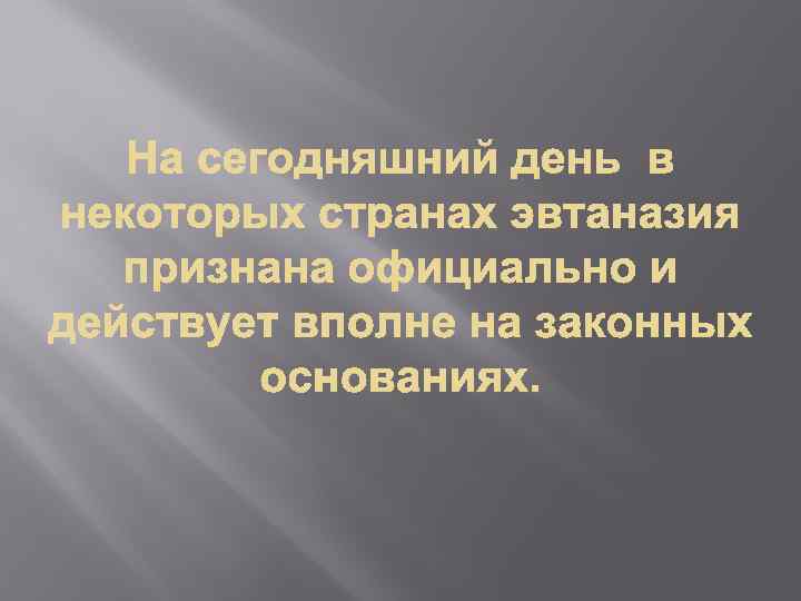 Аргументы «За» Аргументы «Против» Фактически признается право на самоубийство. 1. Жизнь есть благо только тогда, когда в целом удовольствия превалируют над страданиями, положительные эмоции — над отрицательными. Осуществляется выбор не между жизнью-страданием и жизнью-благом, а между жизнью в форме страдания и отсутствием жизни в какой бы то ни было форме. Жизнь даже в форме растений вызывает определенное благоговение. Поэтому нельзя отказывать в этом людям, оказавшимся на растительном уровне жизни. 2. Жизнь можно считать благом до тех пор, пока она имеет человеческую форму, существует в поле культуры, нравственных отношений. 3. Поддержание жизни на стадии умирания требует больших финансовых затрат. В рамках мировоззрения, признающего жизнь высшим благом, эвтаназия недопустима. Этот аргумент следует принимать во внимание в пределах практических решений, но нельзя, когда идет речь о нравственном оправдании самого акта эвтаназии.