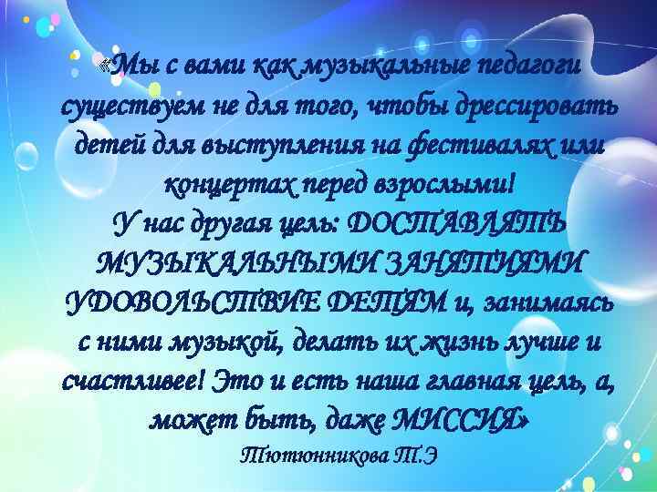 «Мы с вами как музыкальные педагоги существуем не для того, чтобы дрессировать детей для выступления на фестивалях или концертах перед взрослыми! У нас другая цель: ДОСТАВЛЯТЬ МУЗЫКАЛЬНЫМИ ЗАНЯТИЯМИ УДОВОЛЬСТВИЕ ДЕТЯМ и, занимаясь с ними музыкой, делать их жизнь лучше и счастливее! Это и есть наша главная цель, а, может быть, даже МИССИЯ» Тютюнникова Т. Э