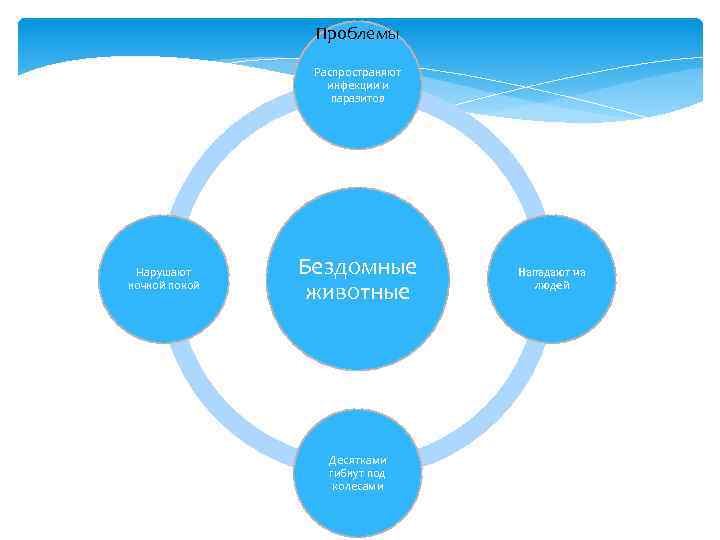 Проблемы Распространяют инфекции и паразитов Нарушают ночной покой Бездомные животные Десятками гибнут под колесами Нападают на людей