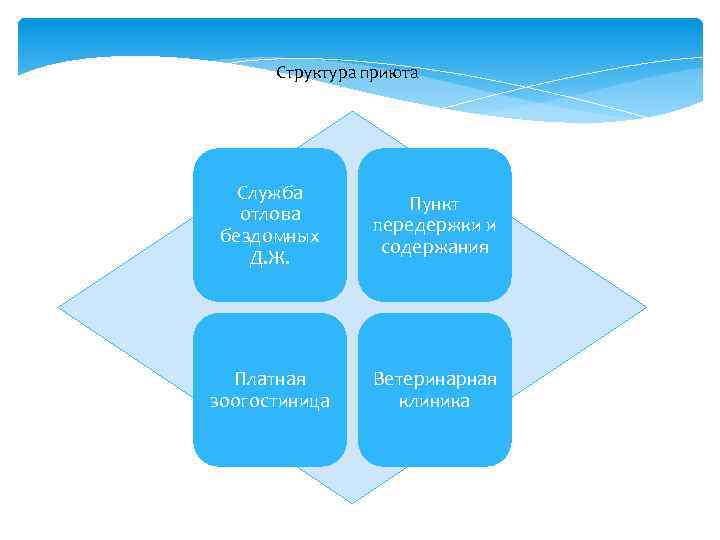 Структура приюта Служба отлова бездомных Д. Ж. Пункт передержки и содержания Платная зоогостиница Ветеринарная клиника