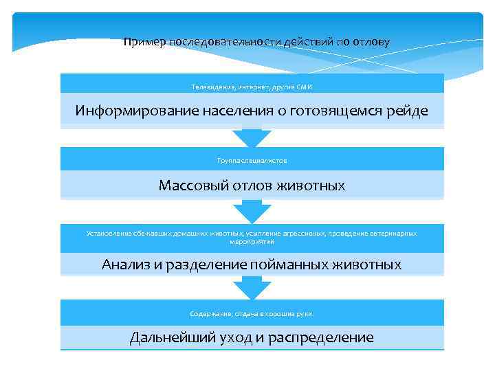 Пример последовательности действий по отлову Телевидение, интернет, другие СМИ Информирование населения о готовящемся рейде Группа специалистов Массовый отлов животных Установление сбежавших домашних животных, усыпление агрессивных, проведение ветеринарных мероприятий Анализ и разделение пойманных животных Содержание, отдача в хорошие руки. Дальнейший уход и распределение