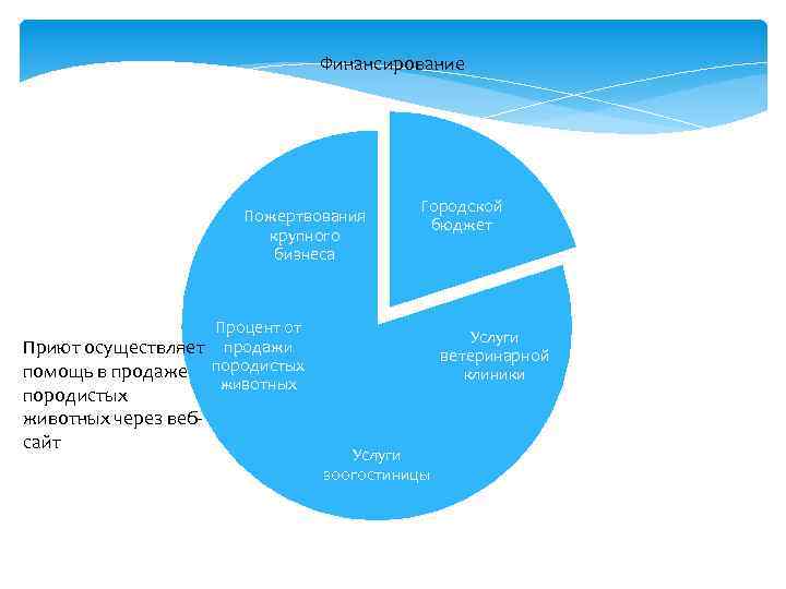 Финансирование Пожертвования крупного бизнеса Городской бюджет Процент от Приют осуществляет продажи помощь в продаже породистых животных через вебсайт Услуги ветеринарной клиники Услуги зоогостиницы