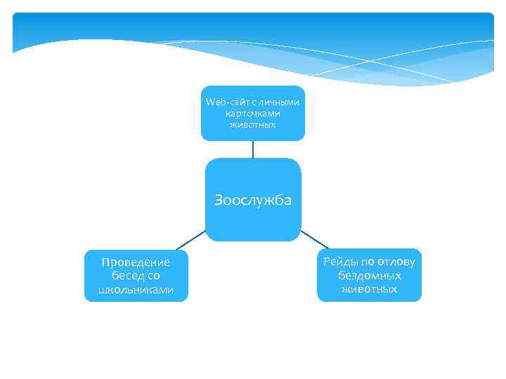Web-сайт с личными карточками животных Зоослужба Проведение бесед со школьниками Рейды по отлову бездомных животных