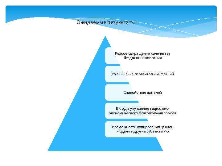 Ожидаемые результаты Резкое сокращение количества бездомных животных Уменьшение паразитов и инфекций Спокойствие жителей Вклад в улучшение социальноэкономического благополучия города Возможность копирования данной модели в другие субъекты РО