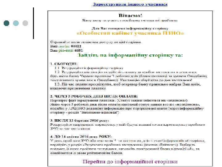 Після реєстрації Після 12 березня 2016 року Зайти в “Особистий кабінет учасника ПЗНО” та роздрукувати запрошення-перепустку на участь у пробному тестуванні. У запрошенні-перепустці буде вказана точна адреса пункту пробного ЗНО та час тестування.