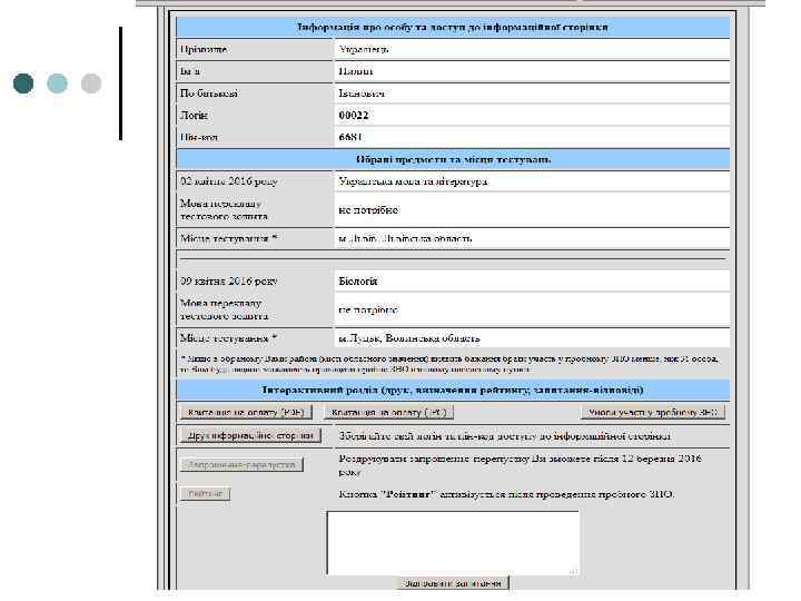 Визначення результатів • самостійно за інформаційними бюлетенями із правильними відповідями, які отримають в пункті пробного ЗНО; • скористатись сервісом з визначення результатів у шкалі 100 -200 балів. Для цього необхідно зайти на свою інформаційну сторінку “Особистий кабінет” (кнопка “Рейтинг”), заповнити електронний бланк відповіді А.