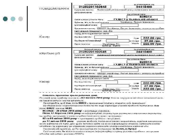 ПРАВИЛА реєстрації 6. Зайти в “Особистий кабінет учасника ПЗНО” та роздрукувати квитанцію для сплати вартості послуг. 7. Здійснити оплату на основі цієї квитанції в установах будь-якого банку України протягом 3 (трьох) робочих днів. Квитанцію зберігати! Вартість участі в одному тестуванні – 111 грн. (за кошти фізичних та юридичних осіб)
