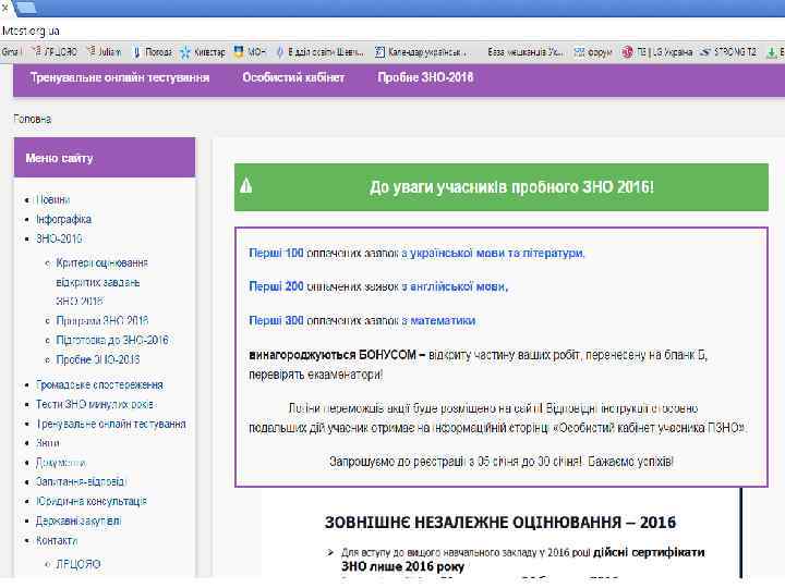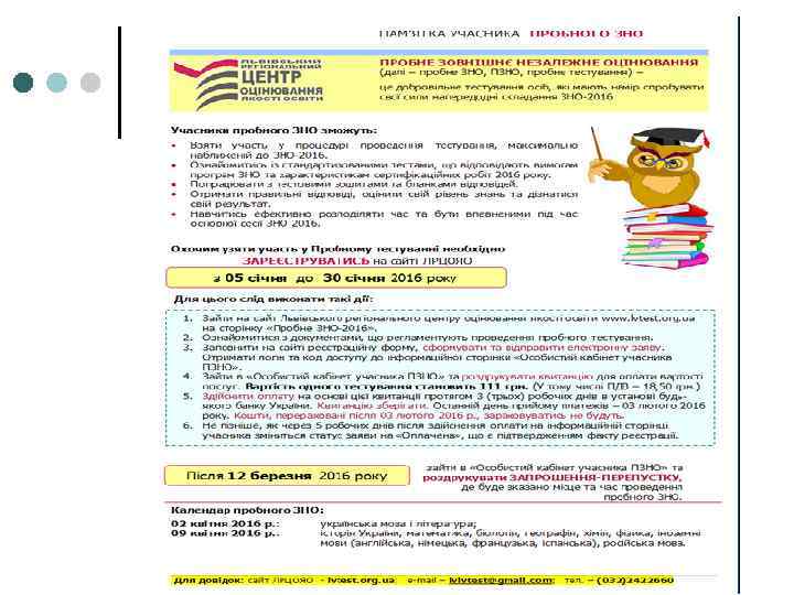 Пробне ЗНО-2016. Календар Реєстрація: з 05. 01 до 30. 01. 2016 року ¢ через мережу Internet на сайті ЛРЦОЯО http: //www. lvtest. org. ua Дні проведення: 02. 04. 2016 р. – українська мова і література; 09. 04. 2016 р. - англійська мова, біологія, географія, іспанська мова, історія України, математика, німецька мова, російська мова, фізика, французька мова, хімія. ¢ Участь в одному тестуванні – 111 грн.