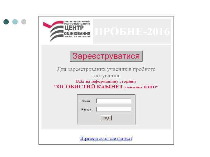 МІСЦЕ реєстрації • Місце реєстрації - сайт ЛРЦОЯО www. lvtest. org. ua, сторінка “Пробне ЗНО - 2016” - основне джерело інформації про організацію, перебіг, підсумки пробного тестування. • Спосіб – Інтернет - реєстрація.